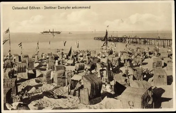 Ak Ostseebad Göhren auf Rügen, Stettiner Dampfer ankommend, Strandpartie