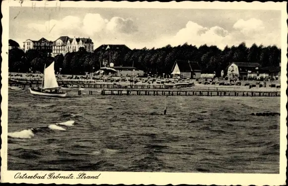 Ak Ostseebad Grömitz in Holstein, Blick auf den Strand, Segelboot