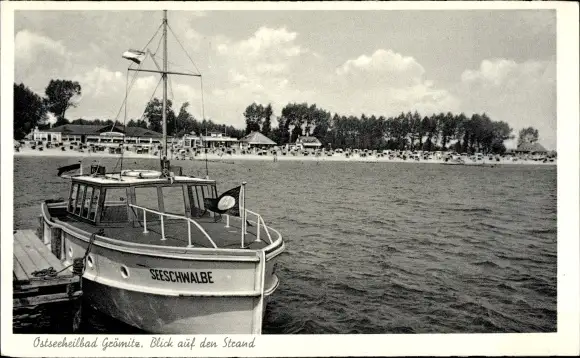 Ak Ostseebad Grömitz in Holstein, Blick zum Strand, Boot Seeschwalbe