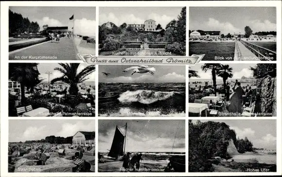 Ak Ostseebad Grömitz in Holstein, Landungsbrücke, Kurpromenade, Strand, Fischer