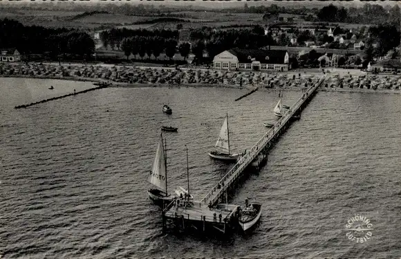 Ak Ostseebad Grömitz in Holstein, Luftbild, Anlegebrücke, Strand