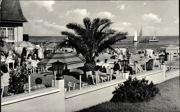 Ak Ostseebad Grömitz in Holstein, Strandhalle, Palmenterrasse, Segelboote