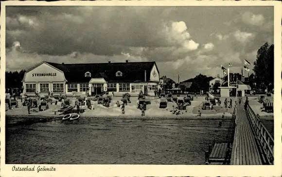 Ak Ostseebad Grömitz in Holstein, Strandhalle, Seebrücke, Strand