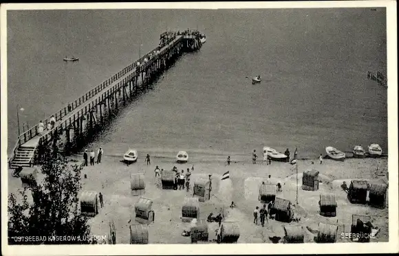 Ak Ostseebad Koserow auf Usedom, Seebrücke, Strand, Boote, Badegäste,