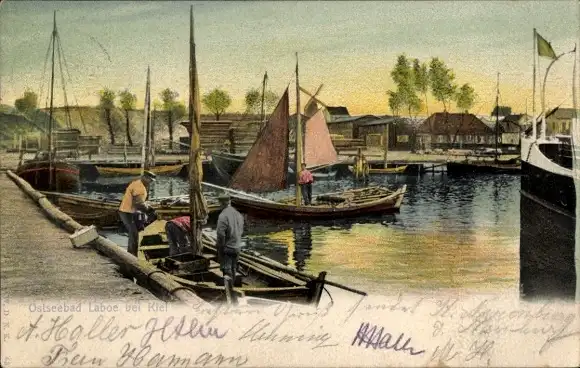 Ak Ostseebad Laboe, Hafen, Männer in Booten