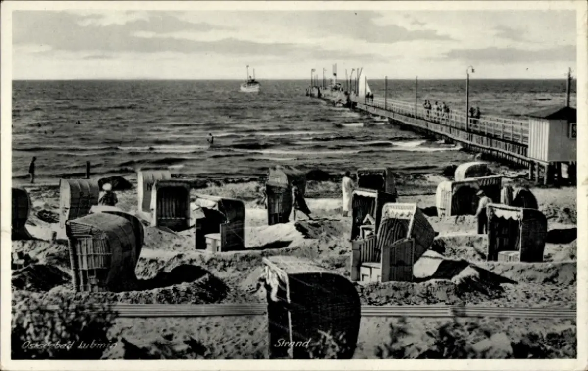 Ak Ostseebad Lubmin in Pommern, Strand, Strandkörbe, Meer, Boot, Pier