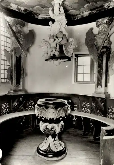 Ak Ostseebad Prerow auf dem Darß, Seemannskirche, Innenansicht, Taufbecken