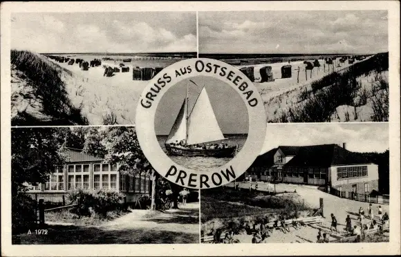 Ak Ostseebad Prerow auf dem Darß, Strand, Badegäste, Strandkörbe, Gebäude, Segelboot