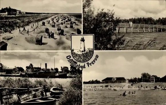 Ak Ostseebad Prerow auf dem Darß, Strand, Ruderboote, Badegäste, Leuchtturm