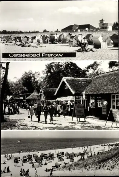 Ak Ostseebad Prerow auf dem Darß, Strandpartie, Ortsansicht, Strandkörbe