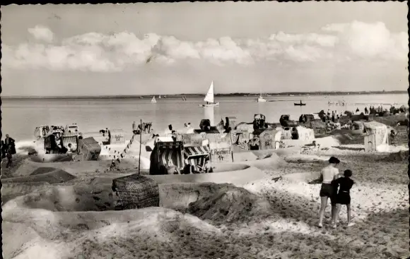 Ak Ostseebad Scharbeutz in Holstein, Strand, Standkörbe, Badegäste, Segelboote