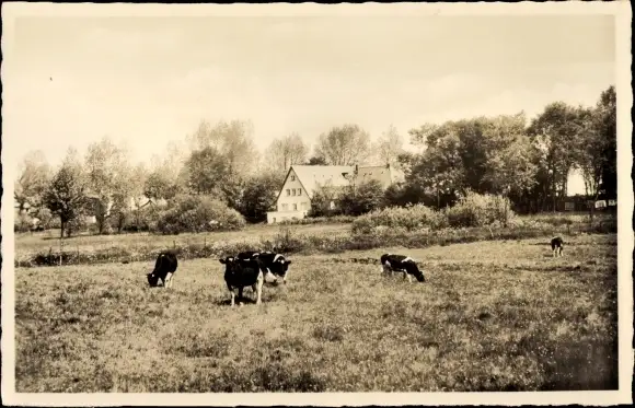 Ak Ostseebad Scharbeutz in Ostholstein, "Das Landhaus", weidende Kühe auf einer Wiese