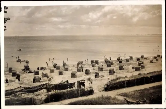 Ak Ostseebad Scharbeutz in Ostholstein, Strand, Strandkörbe, Fischernetze