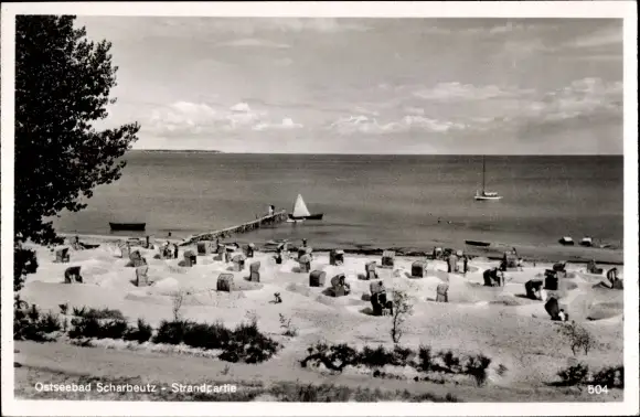 Ak Ostseebad Scharbeutz in Ostholstein, Strandpartie, Strandkörbe, Blick auf die See, Segelboot