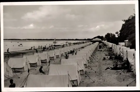 Ak Ostseebad Scharbeutz in Ostholstein, Zelthotelstadt, Campingplatz am Strand, Segelboot