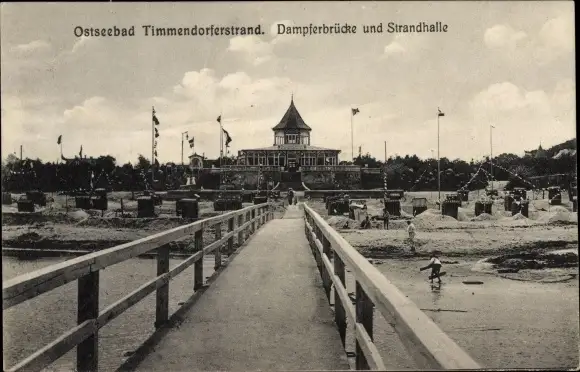 Ak Ostseebad Timmendorfer Strand, Dampferbrücke und Strandhalle