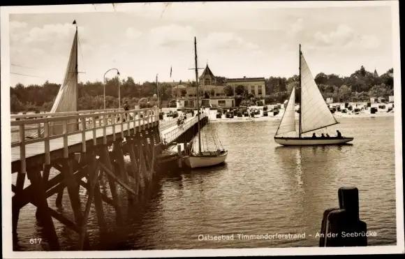 Ak Ostseebad Timmendorfer Strand, Segelboote an der Seebrücke, Strand