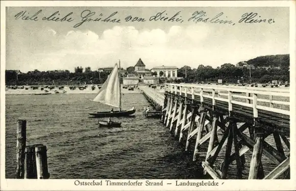 Ak Ostseebad Timmendorfer Strand in Holstein, Landungsbrücke, Segelboot
