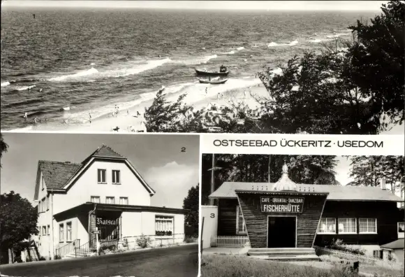 Ak Ostseebad Ückeritz auf Usedom, Strand, Ratscafe, Fischerhütte