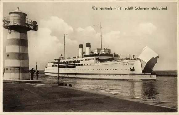 Ak Ostseebad Warnemünde, Fährschiff Schwerin läuft ein, Leuchtturm