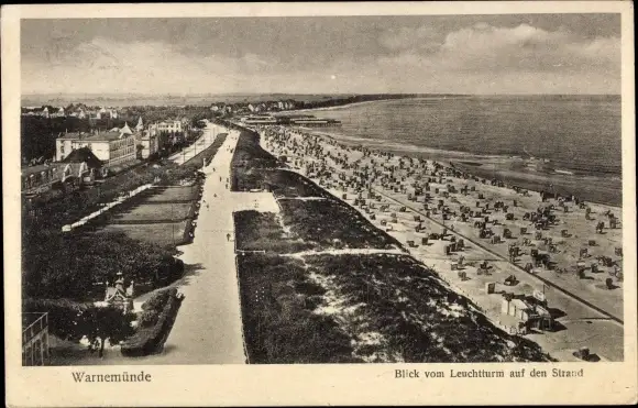 Ak Ostseebad Warnemünde Rostock, Blick vom Leuchtturm auf den Strand, Promenade