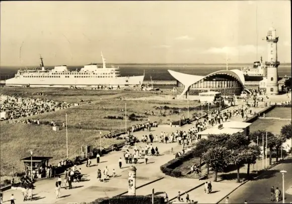 Ak Ostseebad Warnemünde Rostock, Fährschiff der DR Warnemünde, Mole, Leuchtturm, Teepott