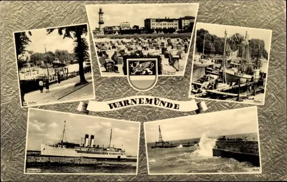 Ak Ostseebad Warnemünde Rostock, Hafen, Strand, Wappen