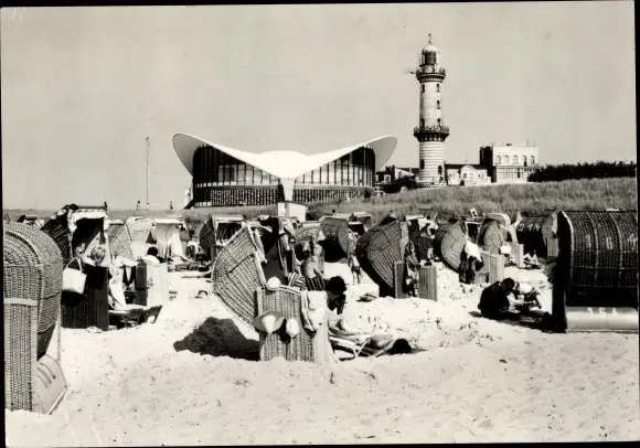 Ak Ostseebad Warnemünde Rostock, Konsum Gaststätte Teepott, Leuchtturm, Strandkörbe
