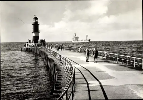 Ak Ostseebad Warnemünde Rostock, Mole, Leuchtturm, Frachtschiff