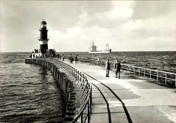 Ak Ostseebad Warnemünde Rostock, Mole, Leuchtturm, Frachtschiff