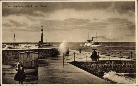 Ak Ostseebad Warnemünde Rostock, Mole bei Sturm, Schiff