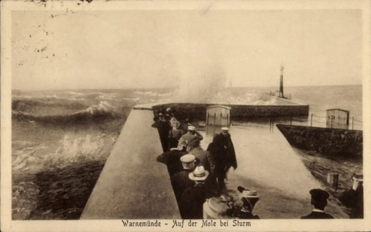 Ak Ostseebad Warnemünde Rostock, Mole bei Sturm, Wellen, Menschen auf der Mole