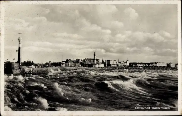 Ak Ostseebad Warnemünde Rostock, Mole bei Wellengang, Leuchtturm