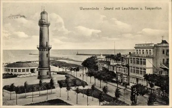 Ak Ostseebad Warnemünde Rostock, Strand mit Leuchtturm und Teepavillon