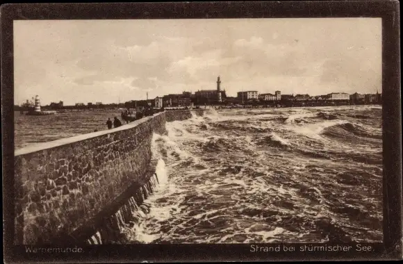 Ak Ostseebad Warnemünde Rostock, Strand, stürmische See, Café Bechlin