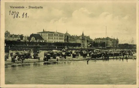 Ak Ostseebad Warnemünde Rostock, Warnemünde Strandpartie, Personen am Strand, im Hintergrund H...
