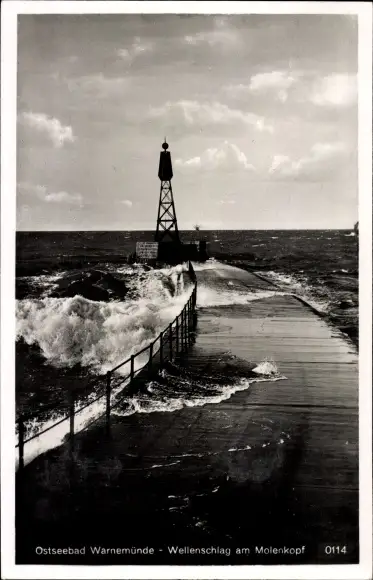 Ak Ostseebad Warnemünde Rostock, Wellenschlag am Molenkopf