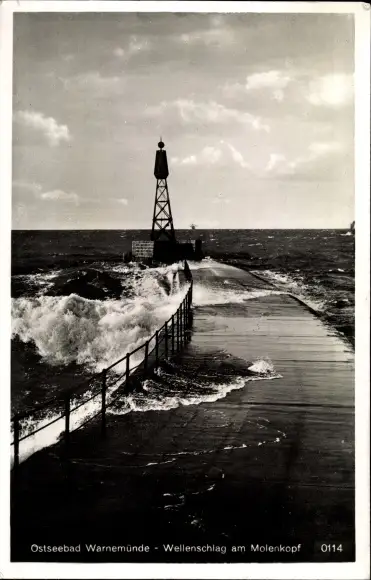 Ak Ostseebad Warnemünde Rostock, Wellenschlag am Molenkopf