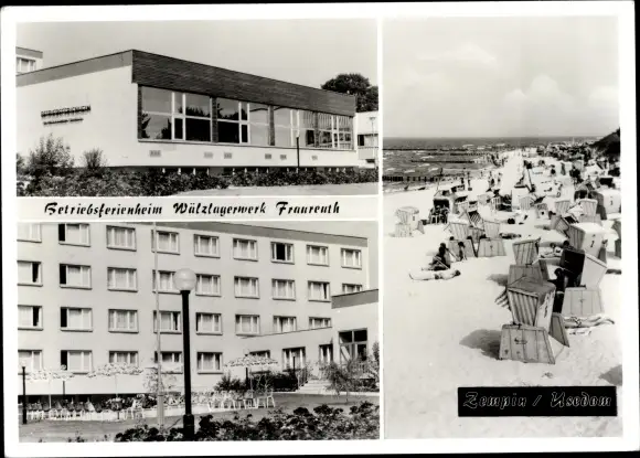 Ak Ostseebad Zempin auf Usedom, Betriebsferienheim Wälzlagerwerk Fraureuth, Strand, Strandkörbe