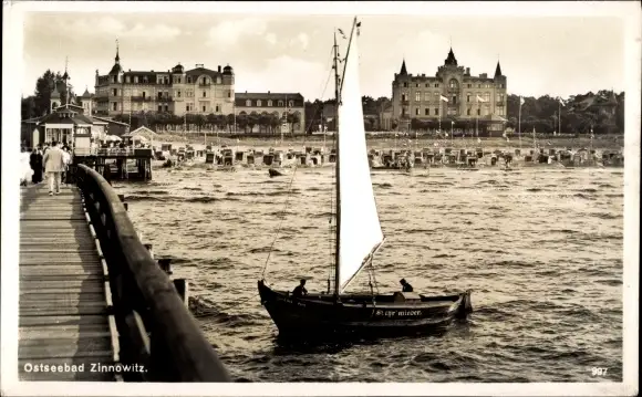 Ak Ostseebad Zinnowitz auf Usedom, Seebrücke, Segelboot, Strand
