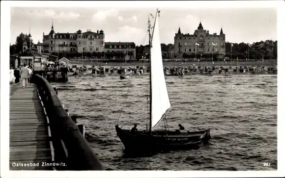 Ak Ostseebad Zinnowitz auf Usedom, Seebrücke, Segelboot, Strand