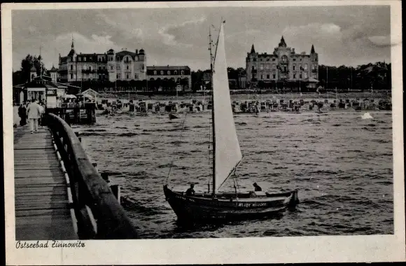 Ak Ostseebad Zinnowitz auf Usedom, Seebrücke, Strandpartie, Segelboot