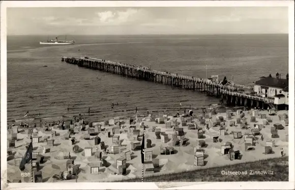 Ak Ostseebad Zinnowitz auf Usedom, Strand, Seebrücke
