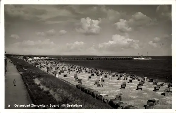 Ak Ostseebad Zinnowitz auf Usedom, Strand mit Seebrücke