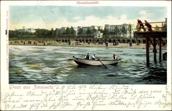 Ak Ostseebad Zinnowitz auf Usedom, Strandansicht, Ruderboot