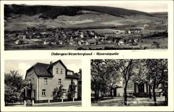 Ak Ottbergen Höxter an der Weser, Fremdenheim Ahrens, Gartenanlage, Panorama vom Ort