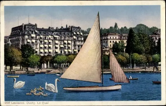 Ak Ouchy Lausanne Kanton Waadt, Le Quai, Segelboote, Schwäne