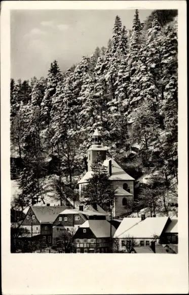 Ak Oybin in der Oberlausitz, Berg und Kirche, Winter