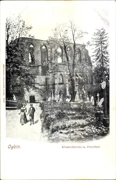 Ak Oybin in der Oberlausitz, Ruine der Klosterkirche, Friedhof mit Statuen, Spaziergänger