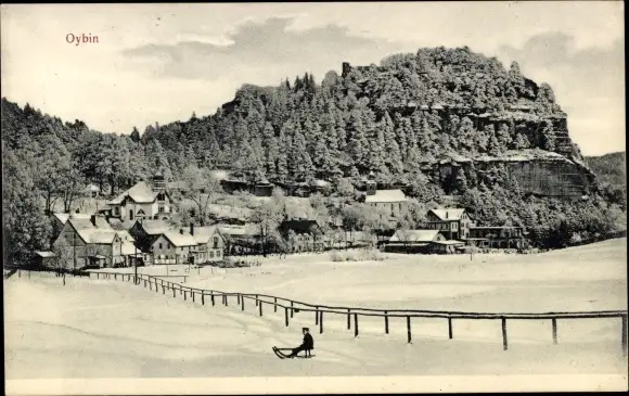 Ak Oybin in der Oberlausitz, Winteransicht, Berg, Schlittenfahrer